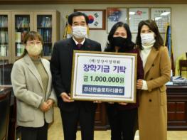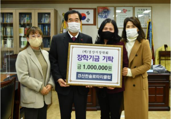 경산한솔로타리클럽(회장 김정옥)이 28일 경산시장학회에 장학 기금 100만 원을 기탁하였다.