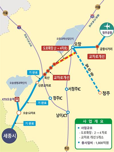 총사업비 1,800억원을 투입해 청주시 옥산면 신촌리(옥산교차로)와 청주국제공항(공항교차로) 사이의 14.3km 구간 중 3.9km를 확장(2→4차로)하고, 교차로 5개소를 입체화하는 계획으로, 사업이 완료되면 행복도시에서 청주국제공항까지 28km 구간이 Non-Stop으로 연결돼 공항이용객들의 접근성과 정시성이 대폭 향상된다.