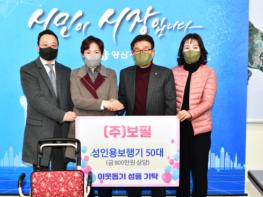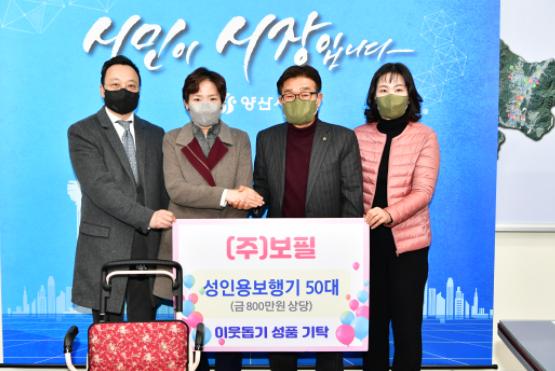 같은날 ㈜보필(대표 전현민, 최성필)에서 지역 내 거동이 불편한 저소득 어르신들을 위해 성인용 보행기 50대(금800만원상당)를 기탁했다. 성인용 보행기는 거동불편자용 보행 보조기로 보행을 지원할 뿐만 아니라 간단한 물품도 운반할 수 있어 거동이 불편한 어르신들의 일상생활을 돕는데 유용하게 사용될 것으로 기대된다.