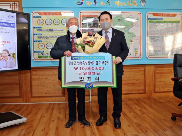 장흥군인재육성장학회는 지난 28일 장흥군청에서 안효식(79세, 건산1구)씨가 장학금 1천만 원을 기부했다고 밝혔다.