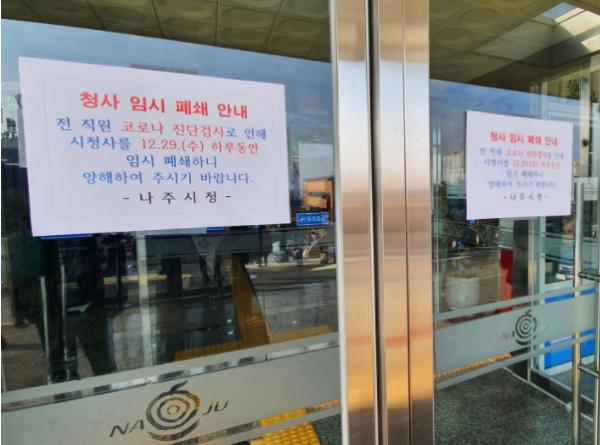 나주시가 29일 청내 직원 코로나19 감염에 따른 추가 확산 차단을 위해 이날 하루 청사 본청과 별관 건물을 임시 폐쇄한다.