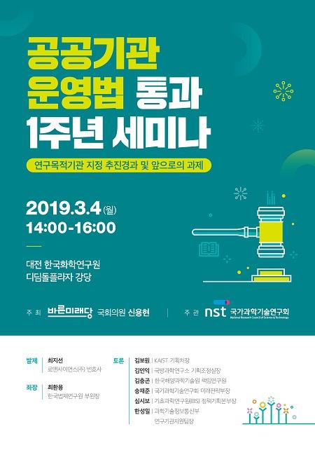 바른미래당 신용현 의원이 주최하고 국가과학기술연구회가 주관하는 ‘공공기관 운영법 통과 1주년 세미나’가 오는 3월 4일 오후 2시 대전 한국화학연구원 디딤돌플라자 강당에서 개최된다.