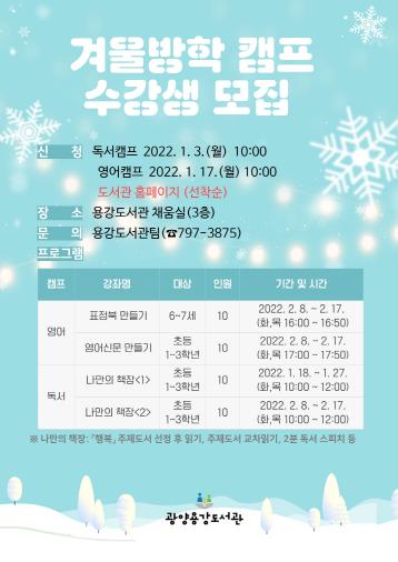 수강 신청과 겨울방학 캠프 운영에 대한 궁금한 사항은 광양시립도서관 홈페이지를 방문하거나, 광양용강도서관으로 문의하면 자세히 알 수 있다.