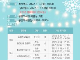 고근성 도서관운영과장은 “용강도서관은 그동안 어린이를 대상으로 한 영어와 독서 프로그램을 꾸준히 운영해 왔다”며, “이번 겨울방학 캠프는 과정별로 수강 인원을 각각 10명으로 제한하기 때문에 서둘러 수강 신청해야 한다”고 말했다.