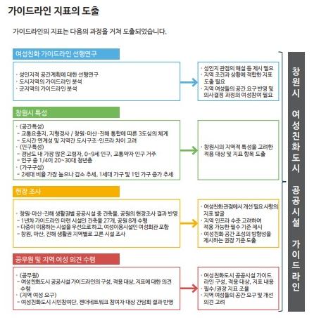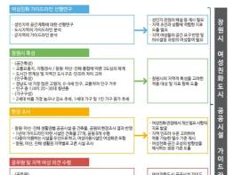 여성친화도시 공공시설 가이드라인은 영유아, 어린이, 고령자, 장애인 및 이를 동반한 여성과 남성의 공간 이용 특성을 고려하여 공공시설 신축 및 개·보수 시 접근성, 편의성, 안전성 확보 및 주민공동체 활동 공간을 마련할 수 있는 방향을 제시하는 지표로 창원시의 특성을 반영하여 2년에 걸쳐 완성할 계획이다.