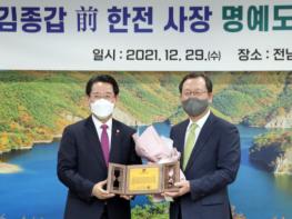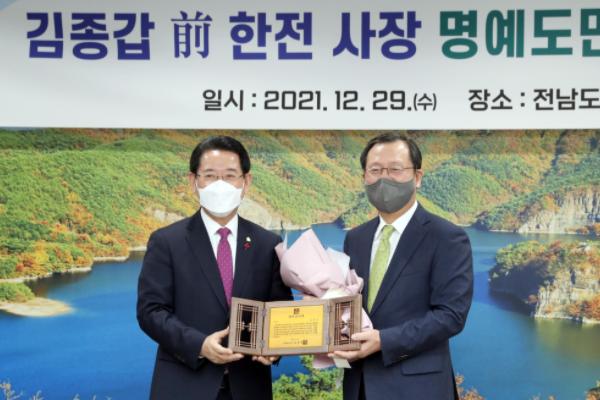 전남도는 29일 도청에서 김영록 전남도지사, 윤의준 한국에너지공대 총장, 이현빈 한국전력공사 부사장 등이 참석한 가운데 김종갑 전 한전 사장에게 명예도민패를 수여했다.