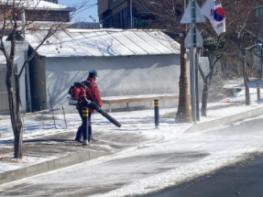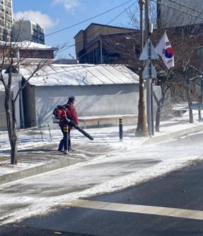 무엇보다 기존에는 넉가래와 빗자루를 이용하거나 염화칼슘 등의 제설제를 통해서만 제설작업을 진행했으나 인력 10명 이상의 몫을 해낼 수 있는 브로워(송풍기)를 통한 제설작업으로 더욱 효과적인 작업이 가능했다는 설명이다.