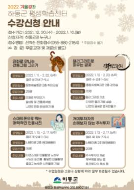 하동군은 군민의 다양한 관심사를 충족시키고 평생교육 참여기회를 확대하기 위해 내달 11일부터 2022년 하동군 평생학습센터 겨울강좌 프로그램을 운영하기로 하고, 수강생을 모집한다고 30일 밝혔다.