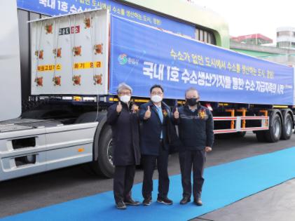 창원시는 30일 성주동 수소에너지순환시스템 실증단지에서 국내 1호로 구축된 수소생산기지의 본격 가동으로 자체 생산한 수소가스의 출하 기념행사를 개최했다.