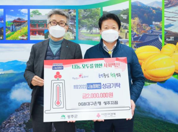 성주군은 DGB대구은행 성주지점에서 29일 군청을 방문해 희망2022나눔캠페인 이웃돕기 성금 200만원을 전달하였다고 밝혔다.