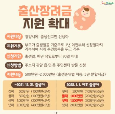 광양시에 거주하는 출산가정은 출산장려금과 첫만남이용권 지원을 모두 신청할 수 있으며 거주기간 등 지원요건을 충족할 경우 최대 700~2,200만 원까지 신청 가능하다.