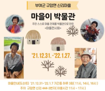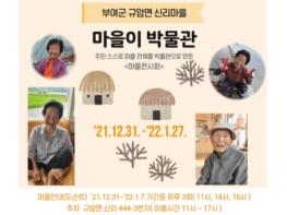 군은 규암면 신리마을에서 주민주도 마을만들기 사업으로 올해 12월 31일부터 내년 1월 27일까지 '마을이 박물관' 프로젝트 전시회를 개최한다.