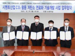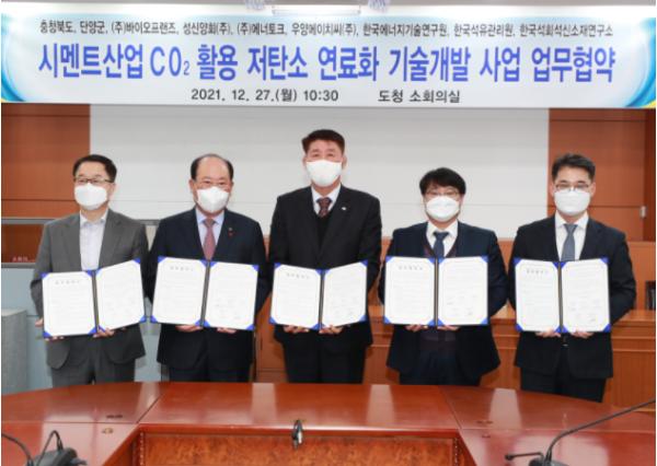 효과적인 사업 추진을 위해 군은 지난 27일 충북도청에서 이시종 지사와 류한우 군수, 시멘트 생산업체인 성신양회(주) 외 3개 기업 대표, 한국석회석신소재연구소 외 2개 연구기관 대표가 참석한 가운데 ‘시멘트산업 배출 CO₂활용 저탄소 연료화 기술개발’을 위한 업무협약식을 진행했다.