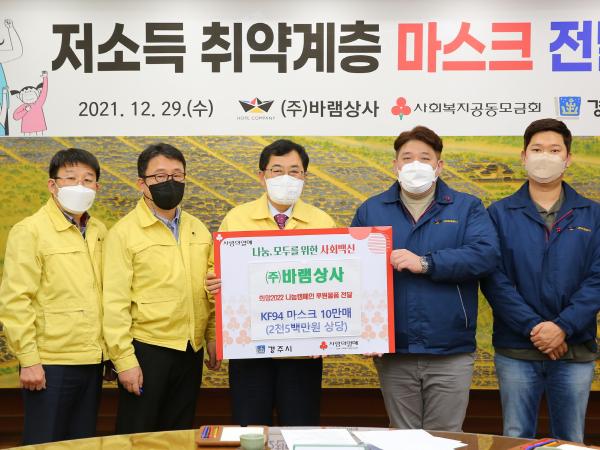 주낙영 경주시장은 ㈜바램상사에 감사의 마음을 전하며, “코로나19로 모두 힘든 시기에 연말연시 따뜻한 미담이 될 것이며, 시에서도 저소득 취약계층 지원을 위한 다양한 대책을 확대해 나가겠다”고 전했다.