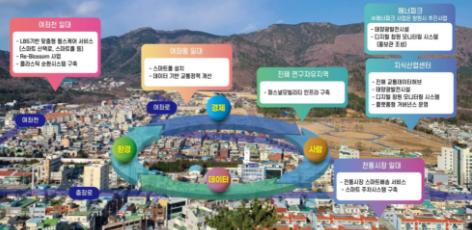 지역특화 스마트도시 테마로 교통, 환경·에너지, 보건·복지로 설정하고, ▲교통분야에서는 고정밀 통신데이터 위치측정 기술 기반 ITS(Intelligent transport system, 지능형 교통 시스템)를 접목, 진해에 특화된 솔루션 적용으로 교통문제를 해결하고자 하였고, ▲환경·에너지 분야에서는 구도심에 에너지의 발전·사용 및 친환경적 행동을 유도하는 순환경제 도입으로 탄소중립 가치 구현을 ▲복건·복지 분야에서는 맞춤형 헬스케어 및 전통시장 스마트배송 서비스를 통해 건강하고 활기찬 도시를 조성할 계획이다.