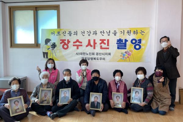 대한노인회 경산시지회에서는 코로나19의 장기화로 비대면 경로당프로그램 7대 사업을 운영하고 있다. 특히 어르신들의 고독감과 외로움을 달래고 행복한 삶을 영위하기 위하여 지난 3월부터'일상생활 영상물 담아드리기'프로그램 일환으로 무병장수와 건강과 안녕을 기원하는 ‘장수 사진 촬영’ 등 다양한 프로그램을 운영하고 있다.