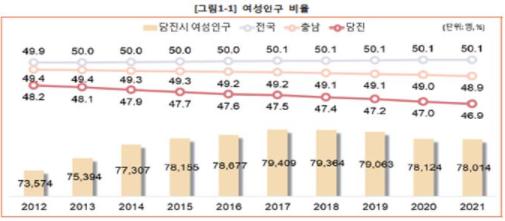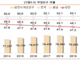 통계자료에 따르면 2021년 5월 말 기준, 당진시 여성인구는 7만8014명으로 전체 인구 16만6491명 중 46.9%를 차치해 2018년(47.35%), 2019년(47.22%), 2020년(47.03%) 대비 소폭 감소한 것으로 나타났다.