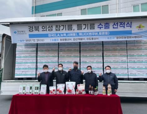 의성군은 지난 29일 청아띠농업회사법인에서 경북도 농축산유통국장, 의성 부군수, 청아띠 대표, 수출관계자 등이 참석한 가운데 북미수출을 위한 수출 선적식을 개최하였다. 이번에 수출되는 선적 물량은 참기름·들기름 4톤(약33만불)으로 미국에서 판매될 예정이다.