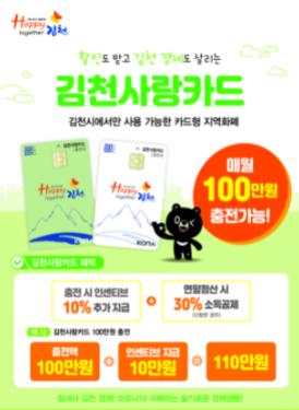 김천시에서는 올한해 김천사랑상품권(카드 포함) 판매액이 12월 30일 기준 1,120억원을 돌파했다고 밝혔다. 종이형 상품권이 244억원, 김천사랑카드가 876억원이며, 사용률도 97%가 넘는 것으로 나타났다.