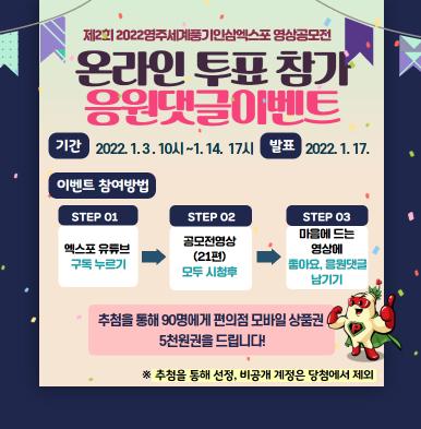 (재)영주세계풍기인삼엑스포조직위원회(위원장 이희범)는 지난 12월 17일까지 접수 받은 ‘제2회 2022영주세계풍기인삼엑스포 영상공모전’ 대국민 심사를 위해 온라인 투표 참가 및 응원 댓글 이벤트를 실시한다.