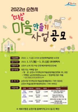 순천시가 마을공동체 활동 지원사업인 ‘2022년 따순마을 만들기 공모사업’참여자를 모집한다.
