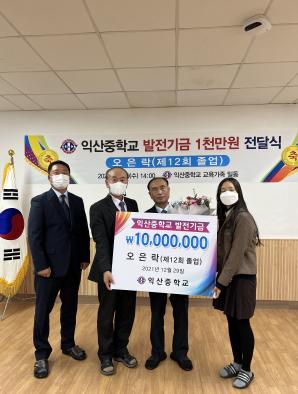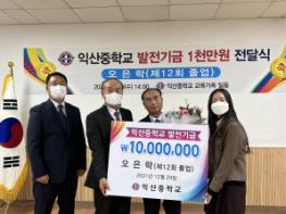 익산중학교에서는 지난 29일 오후 2시 오은락 동문의 발전기금 1,000만원 전달식을 가졌다.