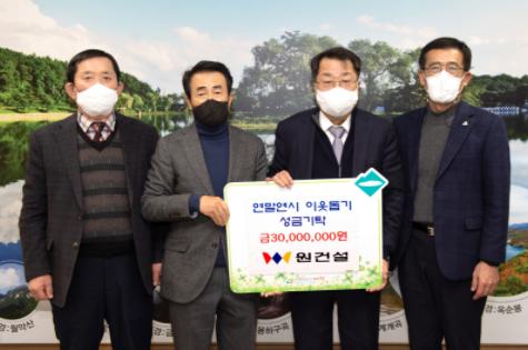 지난 30일 ㈜원건설(회장 김민호)에서는 제천시청을 방문하여 관내 저소득 소외계층에 전달해 달라며 3,000만원의 성금을 전달했다.