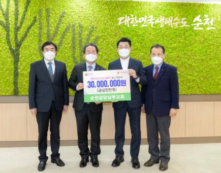순천금당남부교회는 지난 30일 따뜻한 연말을 위해 저소득층 지원에 써달라며 이웃돕기 성금 3,000만원을 순천시에 기탁했다.