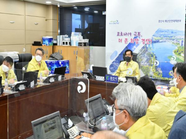 최영조 경산시장은 31일 김부겸 국무총리 주재로 개최된 코로나19 중대본 영상회의 참석 후 부시장, 실·국장이 모두 참석한 가운데 자체 코로나 방역 회의를 했다.