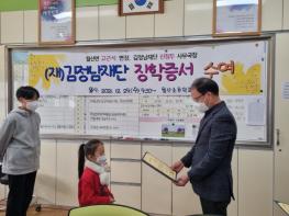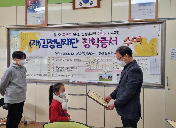 고근석 월산면장은 월산면 지역사회보장협의체에서 준비한 연말선물세트와 함께 장학증서를 전달하면서 “코로나19와 추운날씨로 힘든 시기이지만 김정남 재단의 따뜻한 나눔이 우리 이웃에 큰 선물이 된 것 같다”며 재단에 감사의 뜻을 표했다.