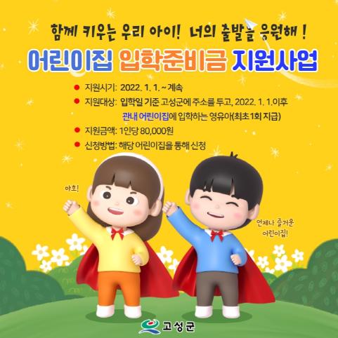 고성군은 2022년부터 어린이집에 입학하는 신입 영·유아에게 입학준비금 8만 원을 지원한다.