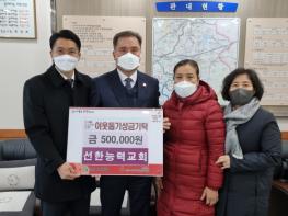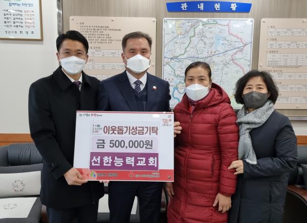선한능력교회는 매년 관내 어렵고 소외된 이웃을 위한 나눔 실천으로 따뜻한 지역사회 조성에 앞장서고 있으며, 올해도 잊지 않고 성금을 기탁하여 추운 겨울 어려운 이웃들에게 사랑의 온기를 나누어 주고 있다.