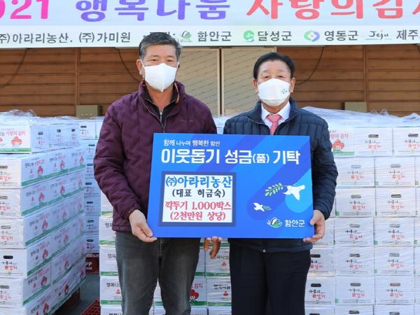 한편, 군북면에 소재한 ㈜아라리농산은 과실 및 절임식품 제조업체로 매년 함안군에 물품을 정기적으로 기탁하는 등 기부문화 확산에 앞장서고 있다.