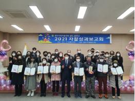 코로나19 방역지침에 따라 종사자와 사업 참여주민 일부 등 30여 명이 참석한 가운데 진행된 이번 보고회는 군수 및 의회의장상 표창, 공로상 및 장학금 전달식, 자활사업 참여 수기 발표, 사업성과보고 순으로 진행됐다. 아울러 센터의 지난 20년의 발자취를 돌아보고, 앞으로의 활동을 다짐하는 시간을 가졌다.