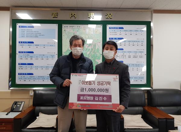 남산면 포도명장 김진수(금 1백만 원), 석원석재에서 31일 남산면행정복지센터를 방문하여 이웃돕기 성금을 기탁했다.