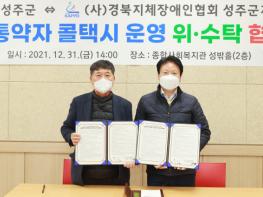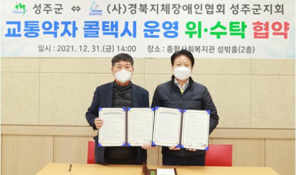 성주군과 (사)경북지체장애인협회성주군지회는 12.31. 14시 성주군 종합사회복지관에서 특별교통수단(교통약자 콜택시) 운영 업무 위·수탁협약을 체결했다. 이번 협약식에서는 군 관계자와 (사)경북지체장애인협회 성주군지회 임원 등 15여명이 참석하여 교통약자의 재활치료, 여가선용 등 사회참여 기회확대를 위한 방안을 논의하였다.