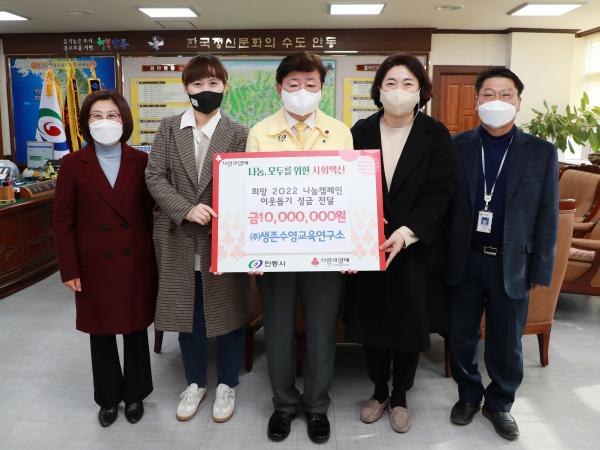 생존수영교육연구소는 어려움을 겪고있는 아동과 이웃을 위해 12월 29일 안동시를 방문하여 성금 1천만 원을 기탁하였다.