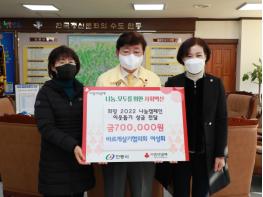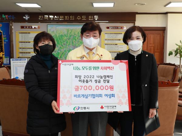 안동시는 바르게살기연합회 여성회로부터 희망2022 나눔캠페인 이웃돕기성금 70만 원을 기부받았다고 12월 29일 밝혔다.