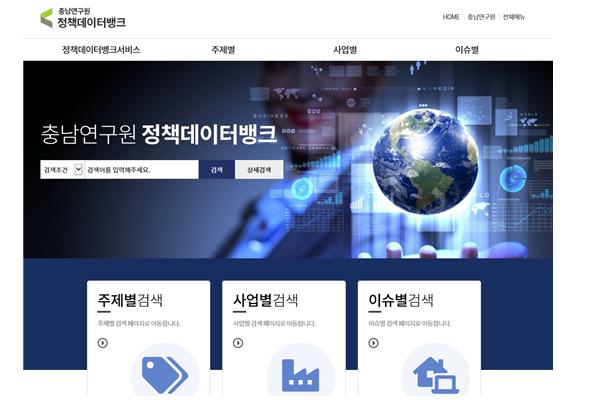 충남연구원 정책데이터뱅크 서비스는 기존 홈페이지와는 달리 대한민국 최초로 연구원 및 충남도에서 수행한 정책연구의 결과와 정책아이디어를 주제별, 사업별, 이슈별로 분류?가공하여 누구든지 접속해 직관적으로 사용하기 쉽도록 구축되었다는 점이다.