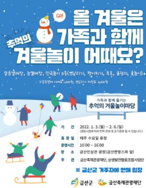 금산군은 1월 3일부터 2월 6일까지 관내 어린이와 청소년들의 야외 즐길거리를 제공하기 위해 금산인삼관 광장에서 ‘추억의 겨울놀이마당’을 개최한다.