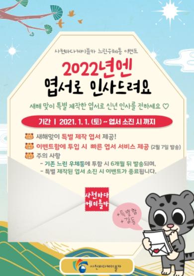 사천시시설관리공단은 새해를 맞아 사천바다케이블카 느린우체통 특별 이벤트인 ‘2022년엔 엽서로 인사드려요’를 실시한다.