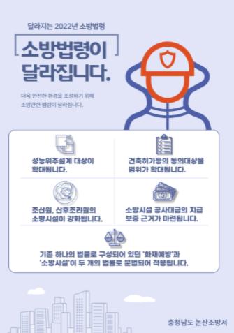 논산소방서는 2022년부터 달라지는 소방 관련 법령 중 시민생활에 영향을 미치거나 알아두면 유용한 주요 사항을 알렸다.