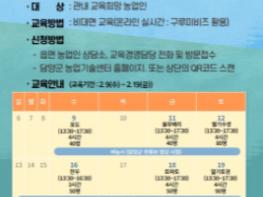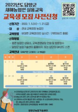 신청은 1월 5일부터 21일까지 전화, 읍면농업인상담소 및 농업기술센터 교육경영팀에 방문접수 또는 포스터의 QR코드를 통해 온라인으로 신청 가능하다.
