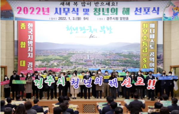 주낙영 경주시장은 3일 오전 시청 알천홀에서 2022년도 시무식을 열고 ‘경주 희망의 무지개 7대 청년 정책’ 발표와 함께 올해를 ‘경주시 청년의 해’로 선포했다.