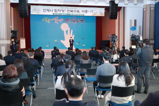 어린이합창단 ‘동요샘’의 축하공연으로 시작된 시무식은 국민의례, 1월 1일자 도교육청 전입 직원 소개, 새해 소망 영상 상영, 김승환 교육감의 신년사 등으?로 이어졌다.