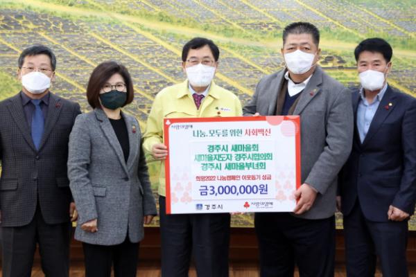 경주시 새마을회와 새마을지도자경주시협의회, 새마을부녀회에서, 지난달 31일 연말연시 회원들의 온정을 모아 경주시청을 방문해 ‘희망2022 나눔캠페인’ 성금 3백만 원을 경북사회복지공동모금회에 기탁했다.