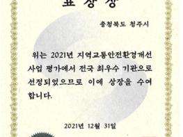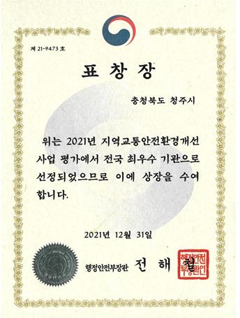 청주시가 행정안전부 주관 ‘2021년 지역교통안전환경 개선사업’평가에서 전국 최우수기관으로 선정돼 장관 표창을 수상했다.