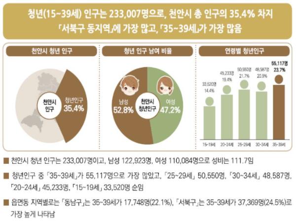 청년통계는 천안시 청년기본조례(18~39세), 청년고용촉진특별법(15~29세)을 합친 만 15~39세를 대상으로 인구·가구, 주택·토지, 복지, 고용, 건강 5개 부문 53개 항목으로 나눠 작성됐다.