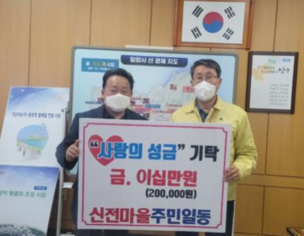 이번 기탁은 추운 겨울을 보낼 주변 어려운 이웃을 위해 신전마을 주민들이 십시일반 훈훈한 마음을 모아 부북면행정복지센터에 전달했다.