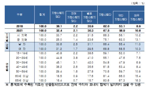 경상남도는 4일 도민 주거지 중심의 생활과 만족도, 주관적 의식에 관한 2021년도 경상남도 사회조사 결과를 발표했다.